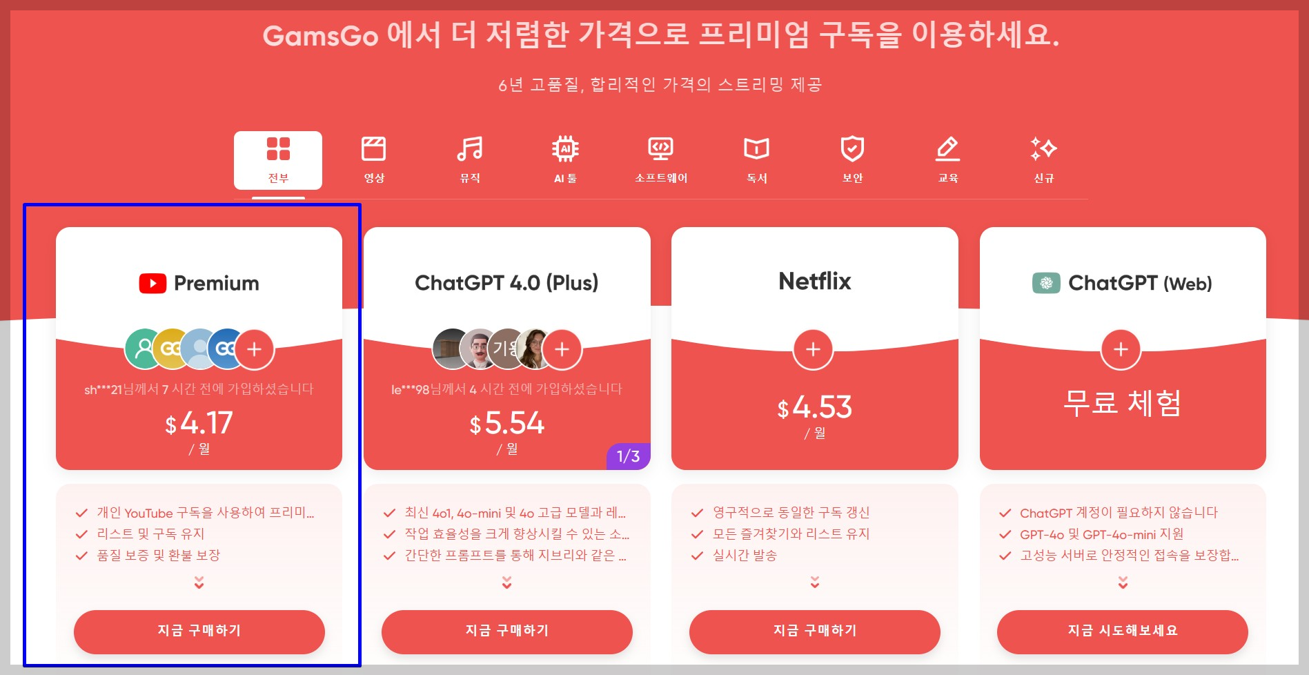 “전 유튜브, 넷플릭스, 어도비, ChatGPT까지 다 쓰는데 한 달 9천원도 안 나가요. 고객 대응도 빠르고 계정 오류 없이 만족 중입니다.”